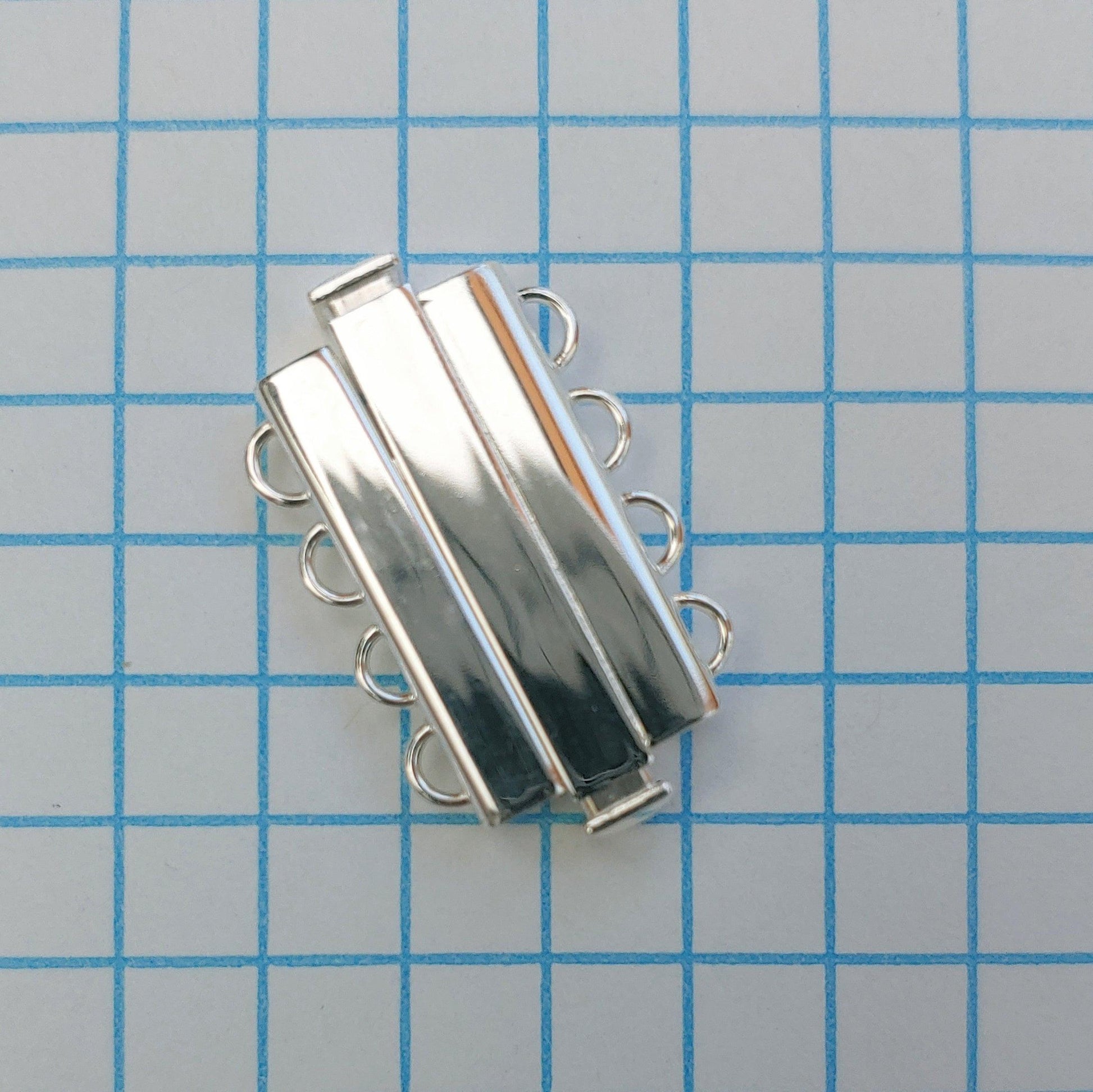 Sterling silver 4-strand pinch clasp 25 x 16 x 4mm & 5-strand 30 x 16 x 4mm with dual-squeeze safety mechanism and bright finish. Features four or five loops on each end for multi-strand designs. Secure closure requires both ends of the center bar to be squeezed simultaneously, preventing accidental opening during wear while remaining easy to operate. Keeps strands evenly spaced for a professional finish.