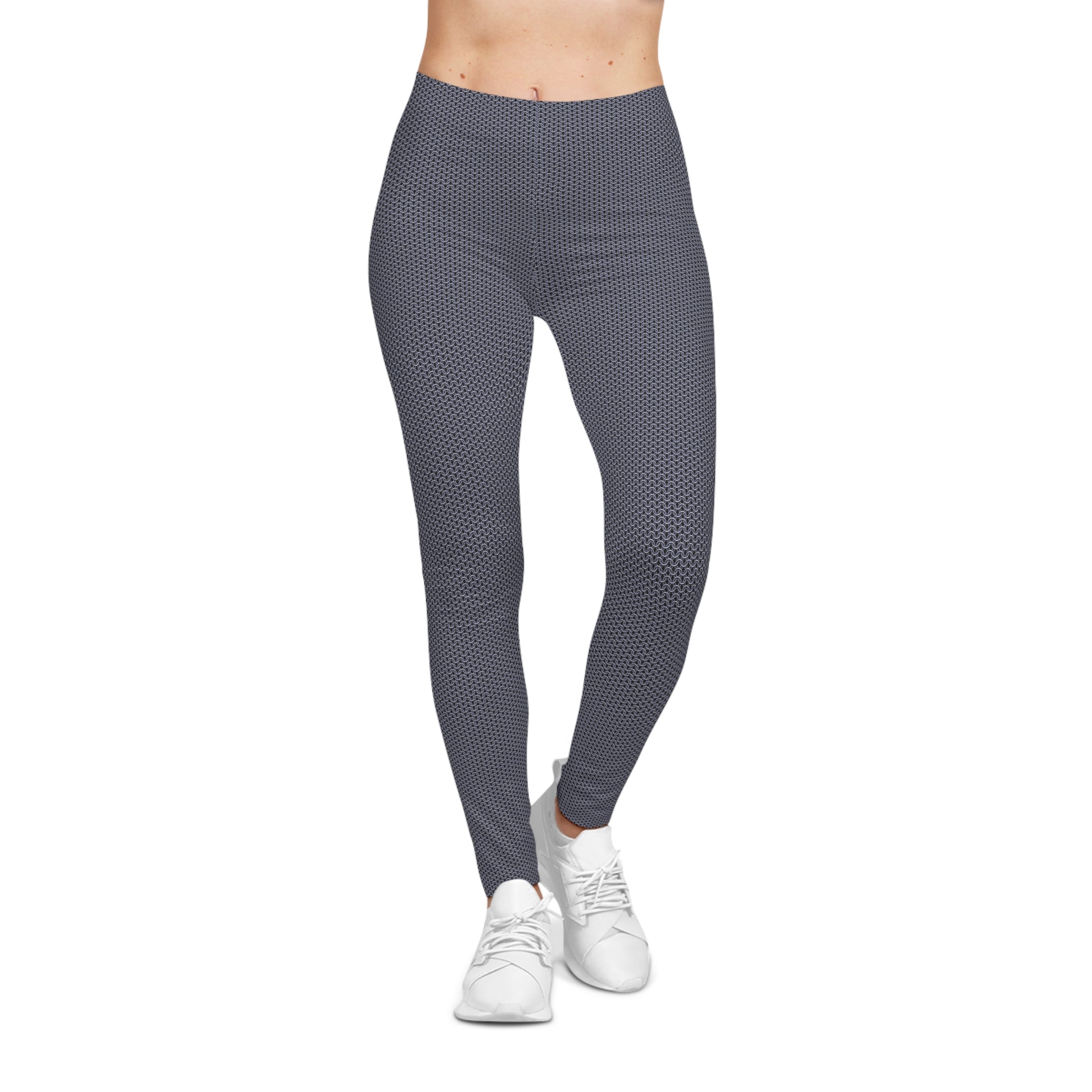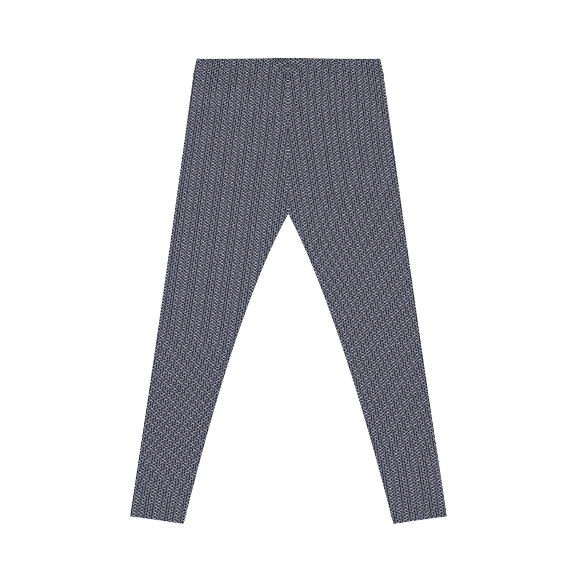 These black leggings wear armor without the weight. A blue tint polished steel chainmaille pattern runs close to the skin, catching light and movement like woven rings. They slip on smooth and move with you—stretchy through hip and thigh, breathable at the waist. Picture late-night motorcycle rides, underground shows, or layering under a long coat for a city evening. They sit mid-rise, so you can pair them with cropped tees or oversized sweaters and keep the chainmaille as the focal point. The print keeps its sharp, metallic look even after repeated wear, so the rebellious, industrial edge stays consistent. For someone who leans into dark textures and tactile contrast, these leggings feel like an essential piece of a curated, urban wardrobe.