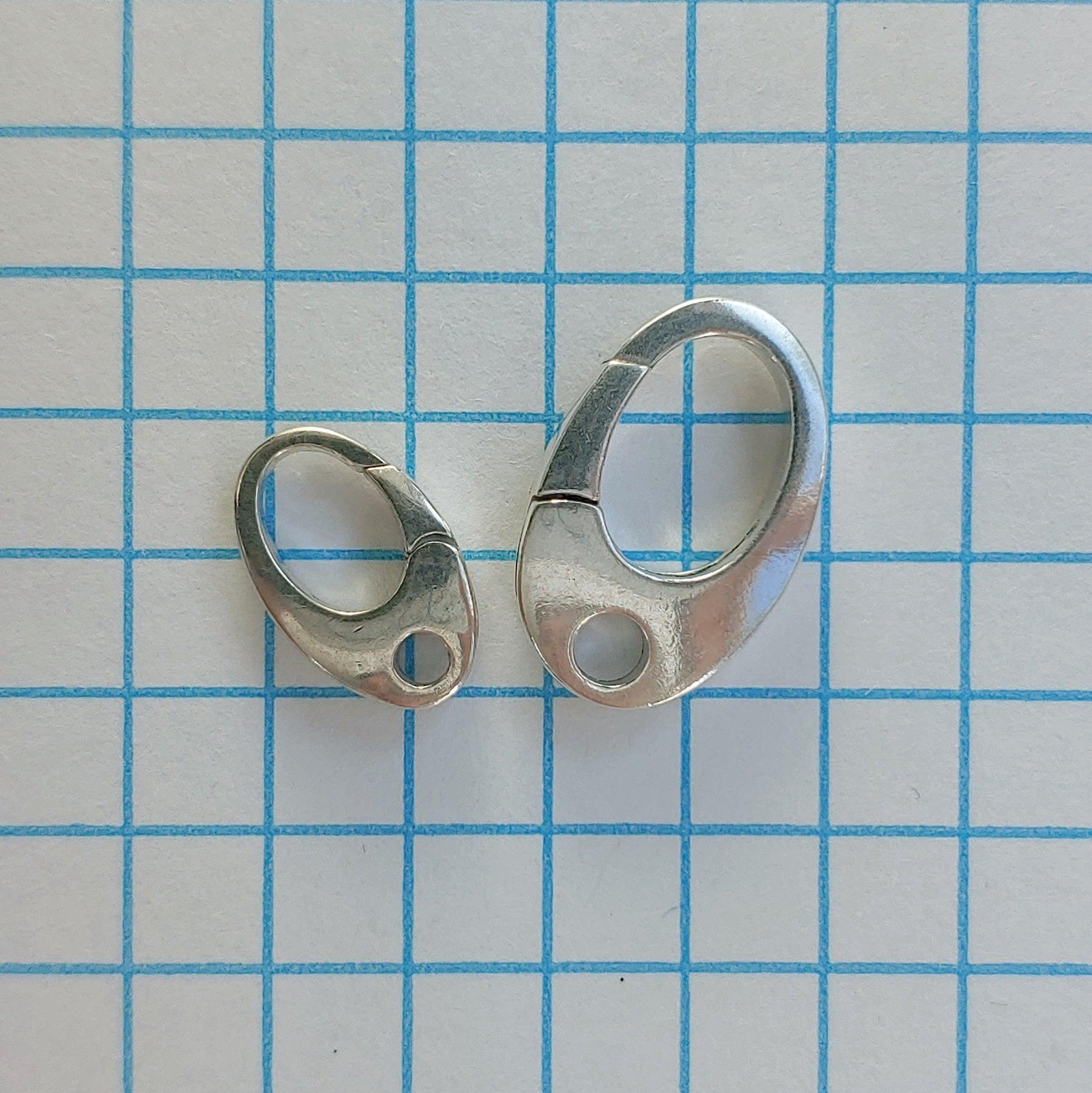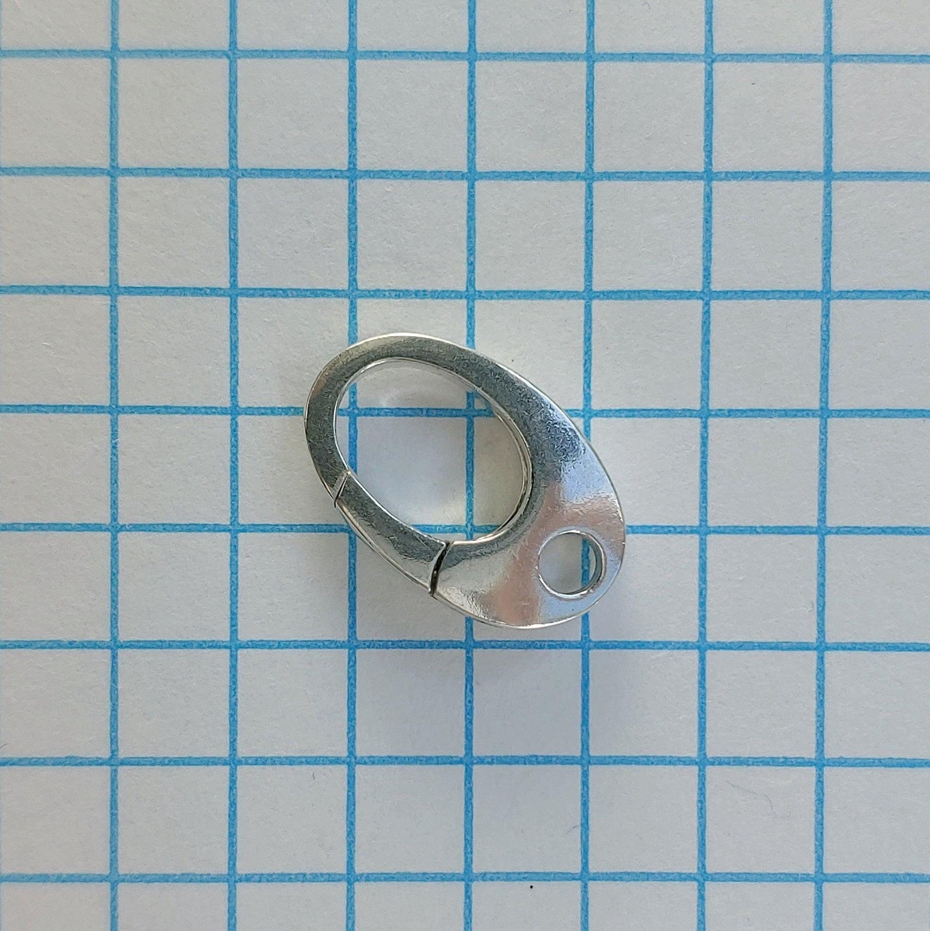 Sterling silver oval carabiner clasp with spring-loaded mechanism. Easy-to-use push feature ensures secure closure - simply push onto a ring to engage the spring mechanism, push again to release. Pair with a plain or fancy ring on the opposite end to complete the clasp.
